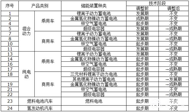 在混合動力乘用車方面,將儲能裝置是超級電容器的技術(shù)階段由原來的發(fā)展期調(diào)整為成熟期。在混合動力商用車方面,將儲能裝置是屬氫化物鎳動力蓄電池的技術(shù)階段,由原來的發(fā)展期調(diào)整為成熟期,將超級電容器的技術(shù)階段由原來的發(fā)展期調(diào)整為成熟期。