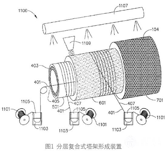 通用電氣公司為復(fù)合材料塔架專利申請量最多的申請人,其在2008年-2011年之間申請了四件專利申請,均涉及現(xiàn)場編織復(fù)合材料塔架及其制造方法。下面介紹其中一篇具有代表性的專利申請。