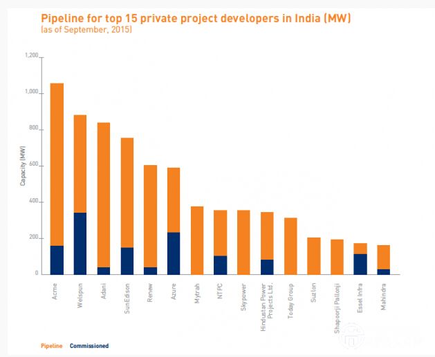 就項(xiàng)目儲(chǔ)備量而言,截至2015年9月(見上圖),Acme、Welspun、Adani、SunEdison和Renew領(lǐng)銜排名前十五位的私營項(xiàng)目開發(fā)商。