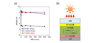 (a)是此次開發(fā)的OPV元件的耐熱性試驗結果。紅色折線為HTL采用氧化鎢(WOx)的元件,藍色折線為HTL采用MoOx的元件,黑色折線是原來的采用p型半導體材料的元件。(b)是元件構造的概要。