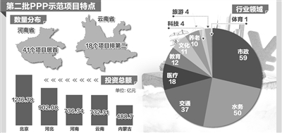 第二批PPP示范項(xiàng)目除了在數(shù)量和投資金額明顯增加之外,投資領(lǐng)域也擴(kuò)展到文化、旅游、科技、養(yǎng)老、教育等社會(huì)類項(xiàng)目,并突出了項(xiàng)目的區(qū)域色彩。在運(yùn)行機(jī)制上,進(jìn)行了政府付費(fèi)和能進(jìn)能出的探索。PPP項(xiàng)目的推進(jìn),將在轉(zhuǎn)變政府職能、激發(fā)市場(chǎng)活力中發(fā)揮更加積極的作用
