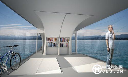 在可移動式太陽能水上漂浮住房里可擺放書架,自行車等