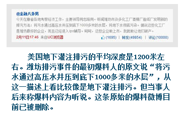 實際上地下灌注排污成本非常高,據(jù)美國杜邦公司的介紹,一次性投資在幾千萬美元以上。目前在東營等地有與美國公司合作的項目在逐步投入應用,但似乎沒有公開資料表明濰坊也有相關項目。