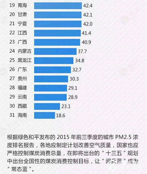 PM2.5濃度最高前三位省份依次為河南省、北京市和河北省,最低為海南省、西藏自治區(qū)和云南省。