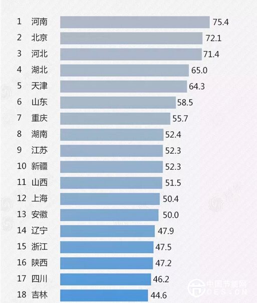 中西部地區(qū)的湖北省、重慶市、湖南省和新疆維吾爾自治區(qū)在省份排名中位于前十名,其空氣污染問題亦值得關(guān)注。