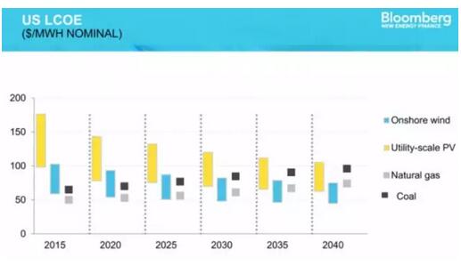 例如,在中國、印度和歐洲,BNEF預測到2020年,光伏發(fā)電的成本將比天然氣更有競爭力。而風電今天已經達到這種水平了。