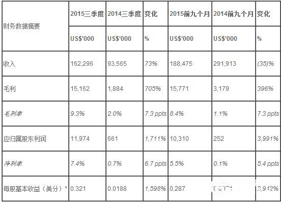 集團(tuán)歸屬于股東的凈利從2014年第三季度的70萬(wàn)美元大幅增加至2015年第三季度的1,200萬(wàn)美元。2015年第三季度和前九個(gè)月的每股基本盈利分別為0.321美分和0.287美分。