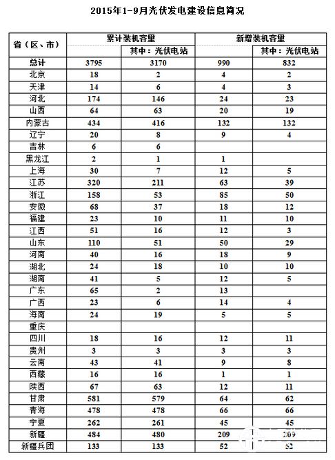 全國各省(區(qū)、市)中,累計光伏發(fā)電裝機容量超過100萬千瓦的達9個,分別為新疆(含兵團)617萬千瓦、甘肅581萬千瓦、青海478萬千瓦、內(nèi)蒙古434萬千瓦、江蘇320萬千瓦、寧夏262萬千瓦、河北174萬千瓦、浙江158萬千瓦、山東110萬千瓦。1-9月新增裝機容量較大的地區(qū)為:新疆(含兵團)261萬千瓦、內(nèi)蒙古132萬千瓦、浙江85萬千瓦、青海66萬千瓦、甘肅64萬千瓦、江蘇63萬千瓦、山東50萬千瓦、寧夏45萬千瓦。全國各省(區(qū)、市)2015年1-9月光伏發(fā)電建設(shè)信息簡況詳見附表。