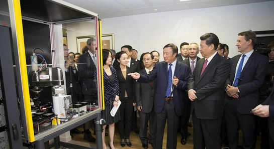 10月21日,習(xí)近平一行參觀華為英國分公司的總部,與華為員工合影。華為總裁任正非陪同。