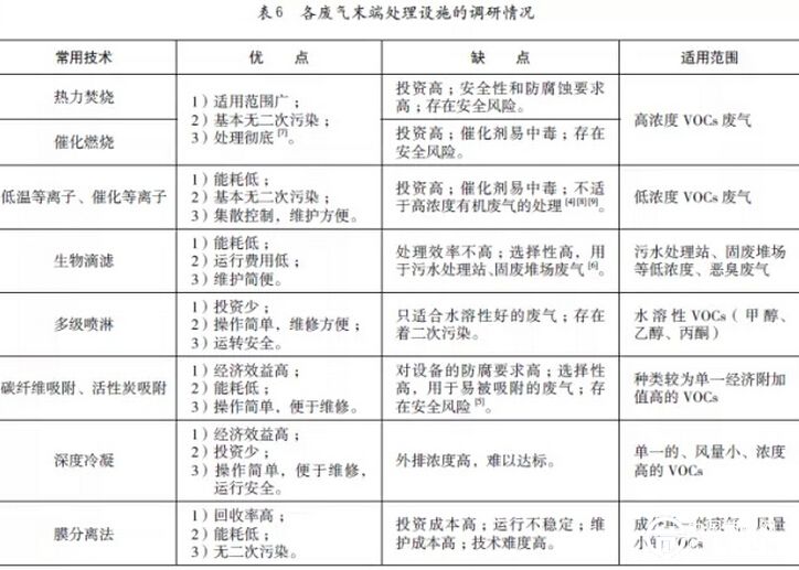 國內外VOCs末端處理技術的優(yōu)點、缺點和適用范圍,對比如表6。