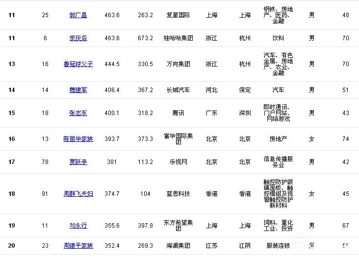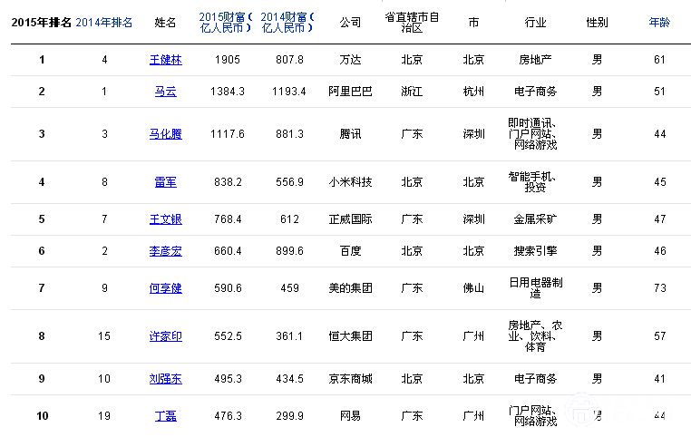 對(duì)于中國(guó)的富豪們來(lái)說,2015又是大展宏圖的一年。2015年福布斯中國(guó)富豪榜上前一百名成員的財(cái)富總和從一年前的3,760億美元躍增至4,500億美元,增幅近20%。大連萬(wàn)達(dá)[微博]集團(tuán)董事長(zhǎng)王健林重新奪回首富之位,財(cái)富從去年的132億美元猛增至300億美元。該榜單同時(shí)發(fā)布于福布斯英文,還將刊登在最新一期《福布斯》亞洲版及中文版雜志上。