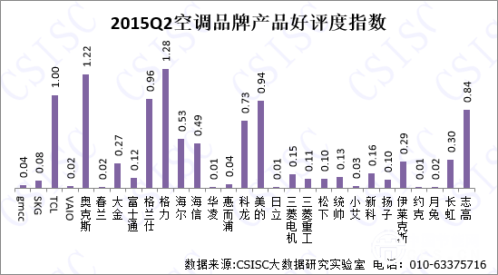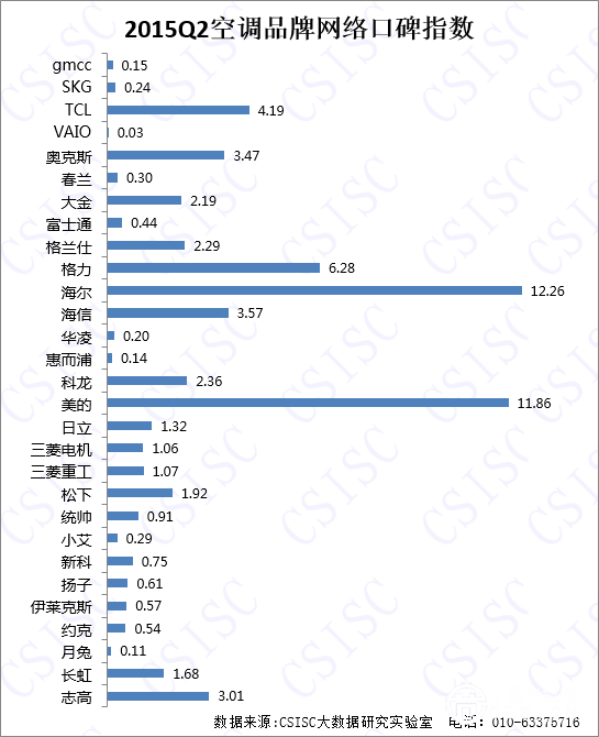 中國統(tǒng)計信息服務(wù)中心聯(lián)合新華網(wǎng)、中國質(zhì)量新聞網(wǎng)今日發(fā)布2015二季度《中國空調(diào)品牌口碑研究報告》(以下簡稱《報告》)?!秷蟾妗芬允袌霰憩F(xiàn)比較活躍的品牌作為監(jiān)測研究對象,共監(jiān)測采集71個品牌數(shù)據(jù),從中篩選出29個各方面比較突出的空調(diào)品牌作為研究對象而產(chǎn)生的。分別是:gmcc、SKG、TCL、VAIO、奧克斯、春蘭、大金、富士通、格蘭仕、格力、海爾、海信、華凌、惠而浦、科龍、美的、日立、三菱電機、三菱重工、松下、統(tǒng)帥、小艾、新科、揚子、伊萊克斯、約克、月兔、長虹、志高(文中品牌按字母排序)。