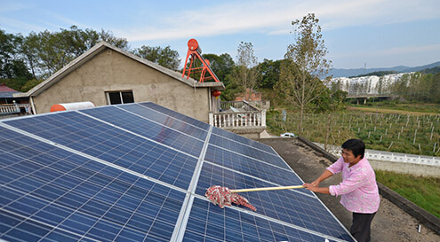 宋承耀的家屬在自家屋頂清理光伏電站發(fā)電板上的污漬,以增加發(fā)電效率。