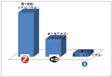 具體到家居互聯(lián)照明協(xié)議,Zigbee適用于整個家庭多個照明燈具互聯(lián)情況,比如多個燈具,開關(guān),遙控互聯(lián),其支持的節(jié)點多,需要組網(wǎng),還要求低成本,低功耗。Wi-Fi可以對客廳中單個或少個燈具進行控制,其在不考慮功耗,還提供音響,視頻監(jiān)控等綜合功能的高價格的吊燈上使用。藍牙可以用在臥室單個燈具比如床頭燈,落地燈等少量燈具間互聯(lián)操作情況。協(xié)議選擇應用如圖1所示。