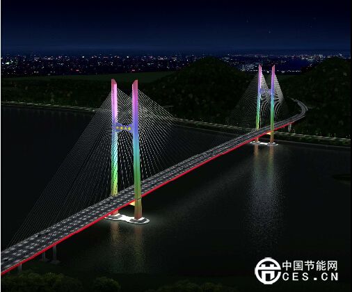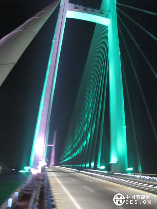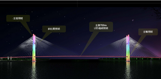 主塔運(yùn)用多彩的LED投光燈進(jìn)行照明。拉索采用130W~290W的投光燈(根據(jù)拉索長(zhǎng)短選擇不同功率的投光燈)對(duì)整根拉索光源追蹤,表現(xiàn)出光與影的變化,光源為L(zhǎng)ED投光燈,明亮的色彩很好地勾勒了扭背索的造型。主橋側(cè)梁采用LED點(diǎn)光源和線(xiàn)光源照明,梁底采用LED投光燈照明,展開(kāi)的扇形受光面亮度漸變產(chǎn)生黃金分割退暈的效果,主塔追逐變色的效果更增添其整體氣勢(shì)。