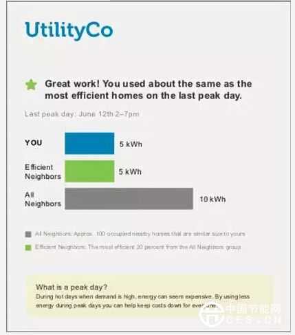 Opower在研究中體會(huì)到,平常情況下家庭用戶對用能情況是漠不關(guān)心的,如何才能促使其關(guān)心用能情況并持續(xù)參與節(jié)能活動(dòng)呢?Opower應(yīng)用行為科學(xué),基于從電力公司獲取的用戶用能數(shù)據(jù),揭示了用戶在用能方面的心理和行為:節(jié)省家庭電費(fèi)、拯救地球等道德說教,諸如此類的激勵(lì)均不發(fā)揮作用,而鄰里之間用能的比較和競爭卻有效激勵(lì)了用戶,起到了很好的效果。