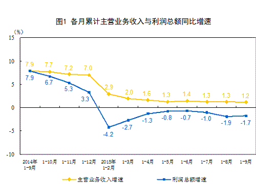 1-9月份,全國(guó)規(guī)模以上工業(yè)企業(yè)實(shí)現(xiàn)利潤(rùn)總額43032.4億元,同比下降1.7%,降幅比1-8月份收窄0.2個(gè)百分點(diǎn)。