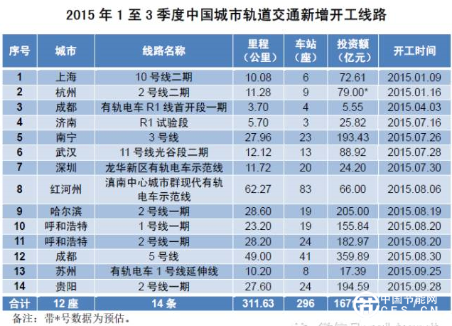 據(jù)中國(guó)軌道交通網(wǎng)統(tǒng)計(jì),2015年1-3季度,中國(guó)共有上海、杭州、成都、濟(jì)南、南寧、武漢、深圳、紅河州、哈爾濱、呼和浩特、蘇州、貴陽(yáng)12座城市新增開工建設(shè)軌道交通線路,合計(jì)開工線路為14條,里程為311.63公里,車站296座,估算投資額合計(jì)為1671.21億元。2015年1至3季度中國(guó)城市軌道交通新增開工線路具體數(shù)據(jù)如下表所示。