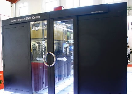 在國(guó)際通信展上,筆者被阿爾法特的廣告所吸引,綠色網(wǎng)絡(luò)、數(shù)據(jù)中心可以節(jié)能15%--90%的電力,這個(gè)力度是否夸張,筆者特意參觀了參展的阿爾法特綠色機(jī)房(Green Internet Data Center),并與現(xiàn)場(chǎng)的技術(shù)員進(jìn)行了討論。阿爾法特(AIRFACT)機(jī)電工業(yè)公司是專門從事網(wǎng)絡(luò)通訊和數(shù)據(jù)中心機(jī)房的廠商,此次參展的綠色機(jī)房占據(jù)了整個(gè)展位超過一半的位置,從圖片我們可以看到,展示用的綠色機(jī)房屬于小型機(jī)房,采用了密閉式設(shè)計(jì),設(shè)計(jì)有兩排,每排有五個(gè)機(jī)柜,足以供一些中型規(guī)模企業(yè)來搭建獨(dú)立的數(shù)據(jù)中心或者網(wǎng)絡(luò)中心。