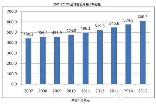 根據(jù)GIA(美國寶石學(xué)院)數(shù)據(jù)顯示:全球園藝用品需求市場長期看處于穩(wěn)定增長,2007年全球園藝用品行業(yè)的市場容量已達(dá)到440.3億美元,受2008年金融危機(jī)的影響,2009年全球園藝用品市場有所收縮,但收縮不大。隨著全球經(jīng)濟(jì)的回暖,園藝用品行業(yè)市場也逐步回暖。預(yù)計(jì)2015年全球園藝用品市場容量將達(dá)606.5億美元。