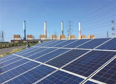 臺灣地區(qū)臺中市龍井區(qū),臺灣電力公司的太陽能電池板。不遠處是該公司的火力發(fā)電廠。