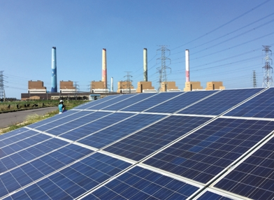 臺(tái)灣地區(qū)臺(tái)中市龍井區(qū),臺(tái)灣電力公司的太陽(yáng)能電池板。不遠(yuǎn)處是該公司的火力發(fā)電廠。