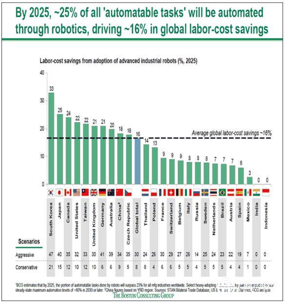報告說,我們正面臨著生活和工作方式的轉變,顛覆性技術創(chuàng)新的發(fā)展速度將從直線型轉變?yōu)閽佄锞€模式。機器人和人工智能已滲透到各行各業(yè),成為了我們日常生活必不可少的部分。任何國家如果不能利用這場機器人革命,其競爭力排名將迅速下滑并被甩到后面。