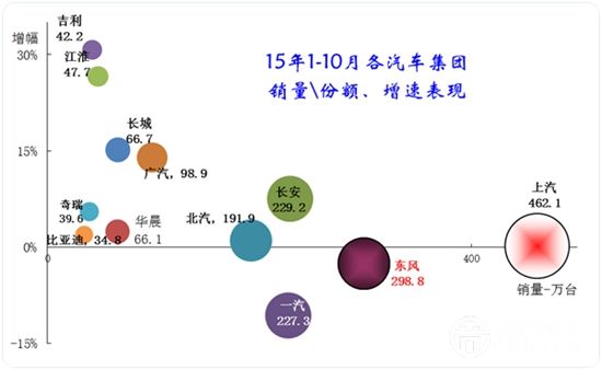 15年1-10月的大集團走勢分化嚴重,一汽和東風嚴重的負增長,而長安和廣汽表現較好。中小集團中都不錯。一汽和東風等大集團因為商用車的比重較大,經濟下滑影響卡車表現,因此表現稍差可以理解。
