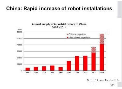 機器人在中國的增長速度十分驚人。據(jù)國際機器人聯(lián)合會公布數(shù)據(jù)顯示,僅在2014年,機器人在中國銷量增長了56%。該機構(gòu)還預(yù)測,到2018年,中國擁有的工業(yè)機器人將占全球總數(shù)1/3以上。