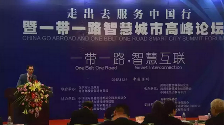 2015年11月16日,由深圳市人民政府、商務(wù)部投資促進(jìn)事務(wù)局共同舉辦,深圳市經(jīng)濟(jì)貿(mào)易和信息化委員會、中國走出去服務(wù)平臺、深圳智慧城市研究會、深圳市智慧城市建設(shè)協(xié)會聯(lián)合承辦的“走出去服務(wù)中國行暨一帶一路國家智慧城市高峰論壇”在深圳會展中心隆重舉行,論壇吸引了400多位專家和企業(yè)家參加。