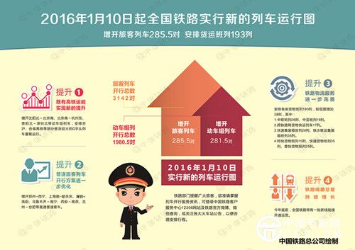 記者從中國鐵路總公司獲悉,從2016年1月10日零時起,全國鐵路將實行新的列車運行圖,增開旅客列車285.5對,其中增開動車組列車281.5對。運行圖調(diào)整后,全國鐵路開行旅客列車總數(shù)達(dá)到3142對,其中動車組列車1980.5對。