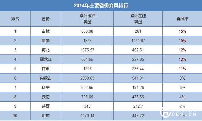風資源豐富、裝機量集中的“三北”地區(qū)棄風最為嚴重。其中,吉林、內蒙古、甘肅等地是棄風最為集中的區(qū)域,最高時棄風率均在25%以上。2014年,隨著“十二五”第四批擬核準風電項目計劃下發(fā),國內風電累計核準量將達到約1.65億千瓦,其中約有9000萬千瓦的風電項目在建。