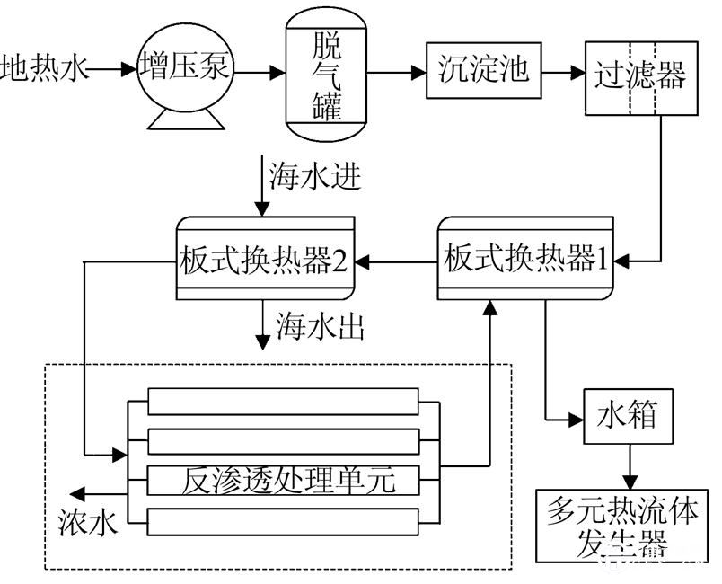 地?zé)崴幚硐到y(tǒng)包含3個單元,分別為預(yù)處理單元、換熱單元、反滲透單元。預(yù)處理單元包括增壓泵、脫氣罐、沉淀池、過濾器等,脫氣罐用于去除H2S及其他伴生氣;沉淀池用于去除大顆粒懸浮物、沙石;過濾器用于去除懸浮物、膠體、有機物及其他粗級雜物。