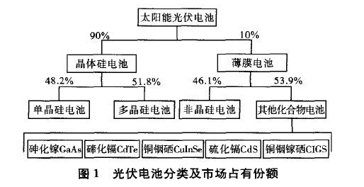 太陽能電池按其所用原料不同可以分為晶體硅太陽能電池、薄膜電池、染料敏化電池和有機太陽能電池等幾類。其中染料敏化太陽能電池和有機太陽能電池尚處于實驗研發(fā)階段,市場占有率極低。圖1顯示了歐洲光伏產(chǎn)業(yè)協(xié)會(EPIA)列舉的太陽能光伏電池分類及市場占有份額。從圖1中可以看出,晶體硅電池仍是光伏產(chǎn)業(yè)的主流產(chǎn)品,市場占有份額約9O%。薄膜電池領域中,化合物薄膜電池市場占有份額在1/2以上,高于非晶硅薄膜電池。