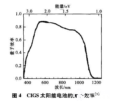 通過改變CIGS吸收層中Ga的含量,可以實現(xiàn)產(chǎn)物禁帶寬度在1.O4~1.68eV之間的可控性調節(jié)。鑒于吸收太陽能理想的禁帶寬度為1.45~1.5eV,通過帶隙優(yōu)化可使CIGS最大限度地吸收太陽能。圖4顯示了高質量CIGS太陽能電池量子效率圖。量子效率是指針對某一波長的入射光收集到的光電流與照射到薄膜表面的該波長的光子數(shù)之比。明顯地,量子效率越高,光電轉換效率越大。從圖4中可以看出,CIGS薄膜電池的光譜響應范圍較寬(350~1100rim),約占太陽能輻射光譜能量的79%,光譜利用率高。