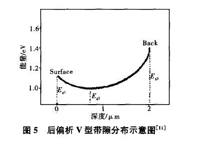 另外,在沉積CIGS吸收層時可制成具有Ga含量偏析的層狀結構,使禁帶寬度呈梯度或V型分布。圖5顯示了后偏析V型帶隙分布示意圖。如圖5所示,薄膜內部存在帶隙極小點(1.0~1.1eV),兩側帶隙較寬。這樣高能量光子在寬帶隙薄膜表面處被吸收,能量較小的紅外光子透過薄膜表面后在帶隙極小處被吸收,從而最大限度地提高光子的吸收效率。另外,后偏析V型帶隙分布由于在靠近Mo背電極附近的吸收層形成勢壘,減少了光生載流子在Mo背電極的復合,從而可獲得更多的電流輸出。