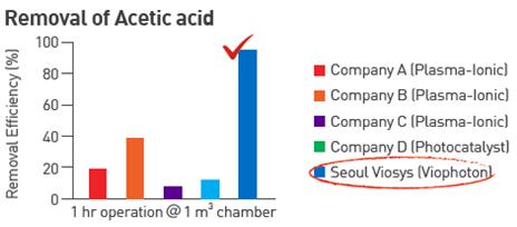 下圖是首爾Viosys的Viophoton技術(shù)與其他公司技術(shù)方案對(duì)甲醛、氨、乙酸等物質(zhì)的祛除率比較,可以看到,Viophoton技術(shù)明顯優(yōu)于其他方案。