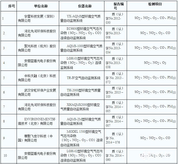 環(huán)境空氣氣態(tài)污染物(SO2、NO2、O3、CO)連續(xù)自動(dòng)監(jiān)測(cè)系統(tǒng)認(rèn)證檢測(cè)合格產(chǎn)品名錄