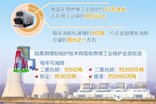 據(jù)初步測(cè)算,如采用煤粉鍋爐技術(shù)將現(xiàn)有燃煤工業(yè)鍋爐全部進(jìn)行改造升級(jí),每年可減排二氧化碳約5億噸、二氧化硫約300萬噸、粉塵約30萬噸、廢渣約3000萬噸,能夠大幅改善我國(guó)的空氣質(zhì)量。