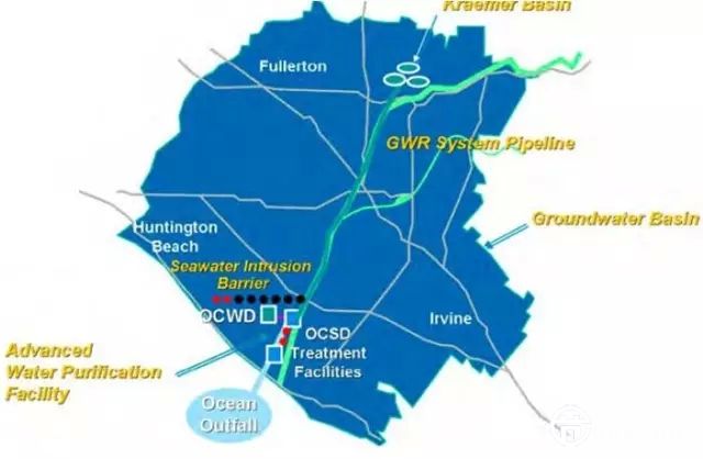 將回用水間接用于飲用水的一個典型案例是美國奧蘭治縣水務(wù)處(Orange County Water District,OCWD)。根據(jù)加州議會法案,奧蘭治縣水務(wù)處1933年建立,旨在管理和保護奧蘭治的地下水流域。現(xiàn)在服務(wù)當(dāng)?shù)?30萬人口。當(dāng)?shù)氐叵滤a給主要來自附近的Santa Ana River河,科多拉多河等河流也是重要的引水來源。從項目開展以來,奧蘭治的地下水的流量增加了兩倍多。圖1顯示了該區(qū)域的總體情況。