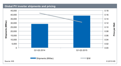 根據(jù)IHS最新發(fā)布的報告顯示,今年1-9月,全球太陽能逆變器出貨量同比增長35%,價格則同比下降26%,從而也限制了市場收益的增長。