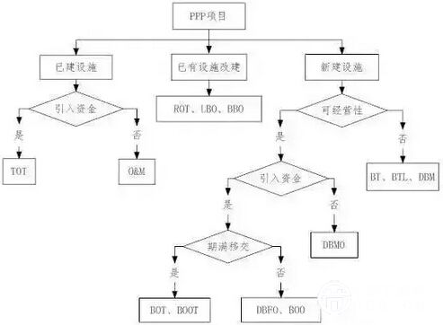 確定PPP項目具體采用哪種運作模式,需根據(jù)項目中政府和社會資本方各自所承擔(dān)的職能和風(fēng)險來進行科學(xué)判定,下面通過決策樹來判定PPP項目的具體運作模式,見圖1。