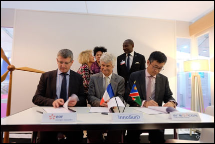 當(dāng)?shù)貢r(shí)間12月4日,中廣核歐洲能源公司、法國(guó)電力新能源公司(EDFEN)和法國(guó)伊諾桑公司(InnoSun)在巴黎氣候大會(huì)期間簽署三方聯(lián)合開(kāi)發(fā)及投資備忘錄。根據(jù)備忘錄,三方將聯(lián)手開(kāi)發(fā)伊諾桑公司在納米比亞持有的500兆瓦太陽(yáng)能及風(fēng)電項(xiàng)目。