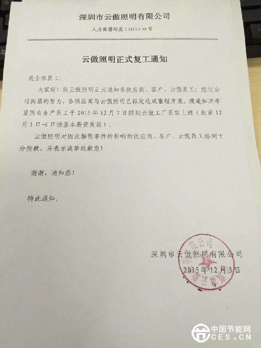 現(xiàn)云傲照明正式通知各供應(yīng)商、客戶、云傲員工;經(jīng)過公司高層的那里,各供應(yīng)商與云傲照明已擬定達(dá)成重組方案?,F(xiàn)通知并希望所有生產(chǎn)員工于2015年12月7日回到云傲工廠正常上班(此前12月1日-6日按基本薪資發(fā)放)。