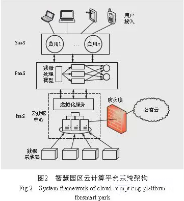 平臺(tái)大量傳感器及數(shù)據(jù)采集終端為云計(jì)算處理及決策提供原始的數(shù)據(jù)信息,包括溫度、濕度等天氣信息。對(duì)于傳感器不能獲取的信息,可能需要借助遙感衛(wèi)星。就云計(jì)算平臺(tái)的服務(wù)對(duì)象和建設(shè)地點(diǎn)而言,智慧園區(qū)云計(jì)算平臺(tái)屬于私有云的范疇。智慧園區(qū)云計(jì)算平臺(tái)系統(tǒng)架構(gòu)見(jiàn)圖2。