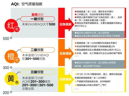 此前,北京市已于12月7日0時啟動了空氣重污染橙色預警。本次升級紅色預警后,應(yīng)急措施將有所加強:建議中小學、幼兒園停課;企事業(yè)單位根據(jù)空氣重污染情況可實行彈性工作制;全市范圍內(nèi)將實施機動車單雙號行駛措施(純電動車除外),其中北京市公務(wù)用車在單雙號行駛的基礎(chǔ)上,再停駛車輛總數(shù)的30%;公共交通運營部門將延長運營時間,加大運輸保障力度;建筑垃圾和渣土運輸車、混凝土罐車、砂石運輸車等重型車輛禁止上路行駛;施工工地停止室外施工作業(yè);增加道路清掃保潔;工業(yè)企業(yè)按紅色預警停限產(chǎn)名單實施停產(chǎn)限產(chǎn)措施;禁止燃放煙花爆竹和露天燒烤。