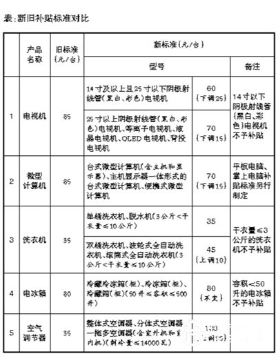 相較于2012年發(fā)布實施的補貼標準,此次新版補貼標準調整主要是:電視機和電腦的補貼標準根據(jù)不同型號從85元/臺下降到60元/臺或70元/臺;洗衣機大部分型號上調10元至45 元/臺;對空調的補貼則由原來的35元/臺大幅上調至130元/臺。同時,新版補貼標準明確指出,對于14寸以下陰極射線管(黑白、彩色)電視機不予補貼。