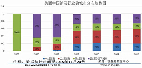 在城市水資源污染和城市大氣污染的雙層夾擊下,未來(lái)新型城鎮(zhèn)化的進(jìn)程必將以綠色生態(tài)文明為著力點(diǎn)。由圖可知,在投融界平臺(tái)上,“美麗中國(guó)”主題項(xiàng)目主要集中在二線城市,且自2013年行業(yè)快速發(fā)展以來(lái),整體城市分布趨勢(shì)基本不變。雖然一線城市的政策、人才和商機(jī)更具優(yōu)勢(shì),但卻并一定能為創(chuàng)業(yè)者所用,城市大失敗幾率也將大大增加。大多數(shù)創(chuàng)業(yè)項(xiàng)目意識(shí)到了這點(diǎn),進(jìn)而利用借鑒和復(fù)制一線城市的成功經(jīng)驗(yàn),到競(jìng)爭(zhēng)壓力稍小的二線城市進(jìn)行創(chuàng)業(yè)。