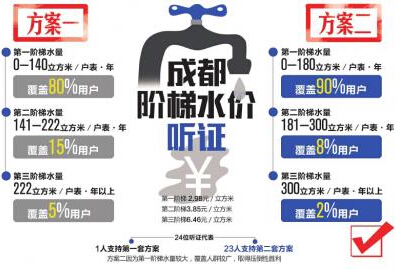 12月8日,成都市舉行中心城區(qū)居民用水階梯價格制度(以下簡稱“階梯水價”)聽證會。24位聽證代表,1人支持第一套方案,23人支持第二套方案。方案二因為第一階梯水量較大,覆蓋人群較廣,取得壓倒性勝利。