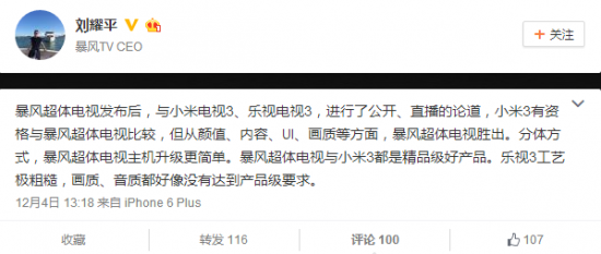 我們看看劉耀平這條微博,對(duì)小米算得上相敬如賓,可對(duì)待同樣A股兄弟的樂(lè)視倒是一點(diǎn)都不客氣:“暴風(fēng)超體電視發(fā)布后,與小米電視3、樂(lè)視電視 3,進(jìn)行了公開(kāi)、直播的論道,小米3有資格與暴風(fēng)超體電視比較,但從顏值、內(nèi)容、UI、畫(huà)質(zhì)等方面,暴風(fēng)超體電視勝出。分體方式,暴風(fēng)超體電視主機(jī)升級(jí)更 簡(jiǎn)單。暴風(fēng)超體電視與小米3都是精品級(jí)好產(chǎn)品。樂(lè)視3工藝極粗糙,畫(huà)質(zhì)、音質(zhì)都好像沒(méi)有達(dá)到產(chǎn)品級(jí)要求。”